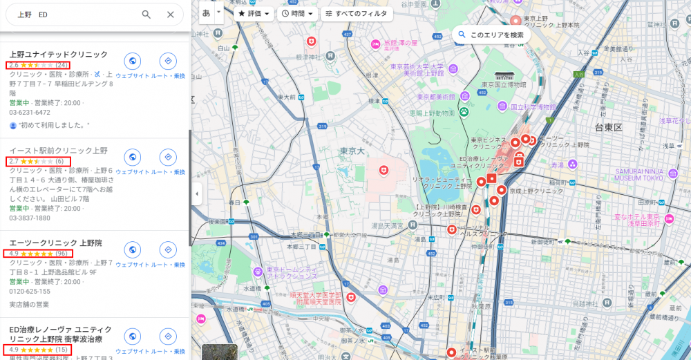 上野でED治療を受けるクリニックを選ぶ際は、Googleマップの口コミをチェックしてみましょう。