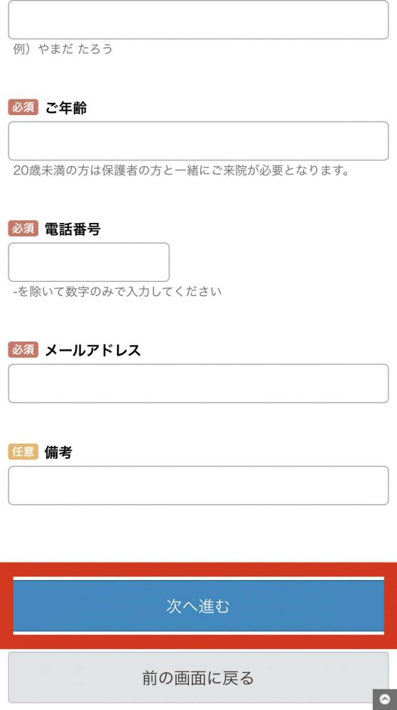 ③予約者情報を順に入力して「次へ進む」をタップする。