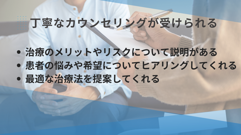 「ここで包茎手術を受けよう!」と決める際は、医師からていねいなカウンセリングが受けられるかどうかに着目しましょう。