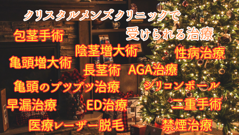クリスタルメンズクリニックでは「包茎手術」「亀頭増大術」「陰茎増大術」「長茎術」「早漏治療」「亀頭のブツブツ治療」「性病治療」「ED治療」「シリコンボール」の9種類の男性器治療が可能です。