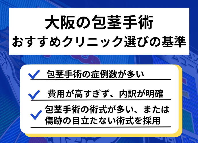 大阪には、大阪駅周辺を中心に包茎手術を受けられるクリニックが多数あります。後悔のない治療を受けるためには、費用の安さだけではなく、総合的に比較することが大切です。