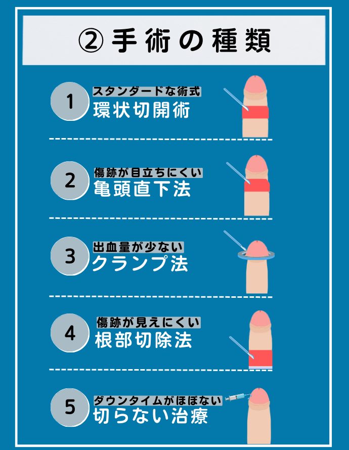 包茎手術では、余分な包皮を切除しますが、切除の仕方によっていくつかの種類に分かれます。